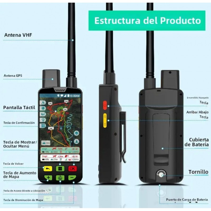 Disponible en pantalla mapas satélites,topográficos y brújula. Pantalla táctil y botones.