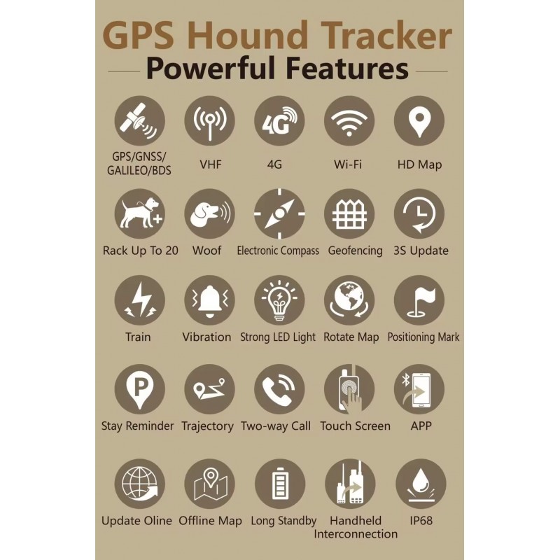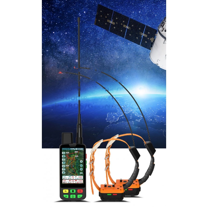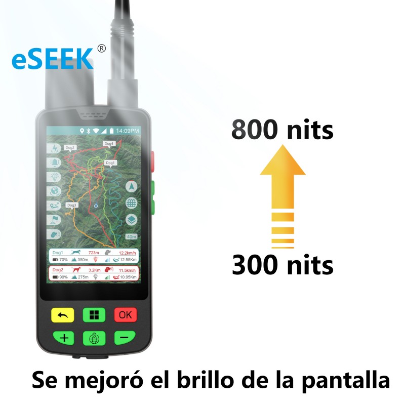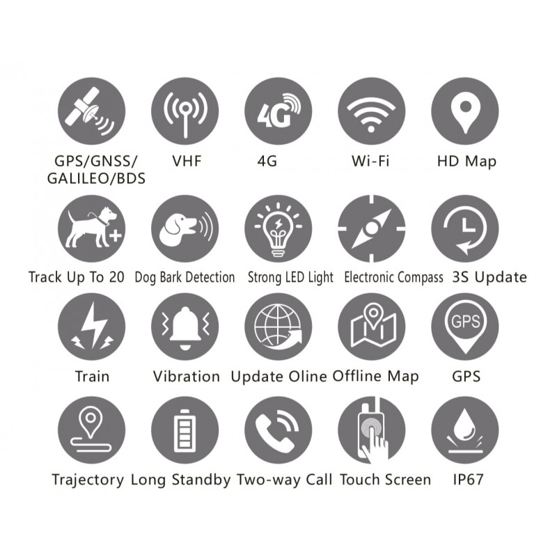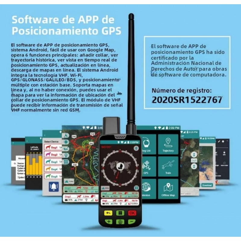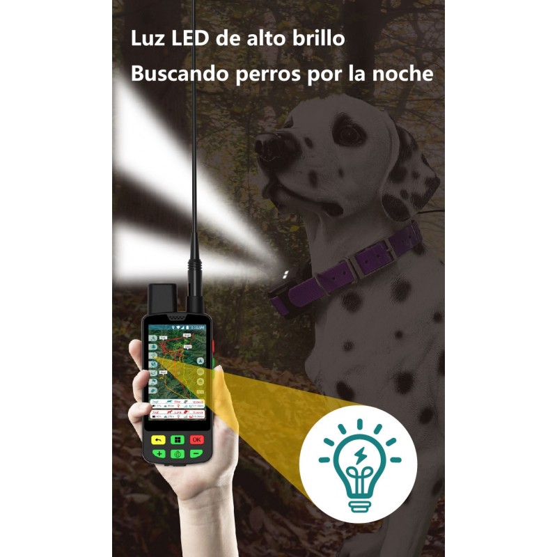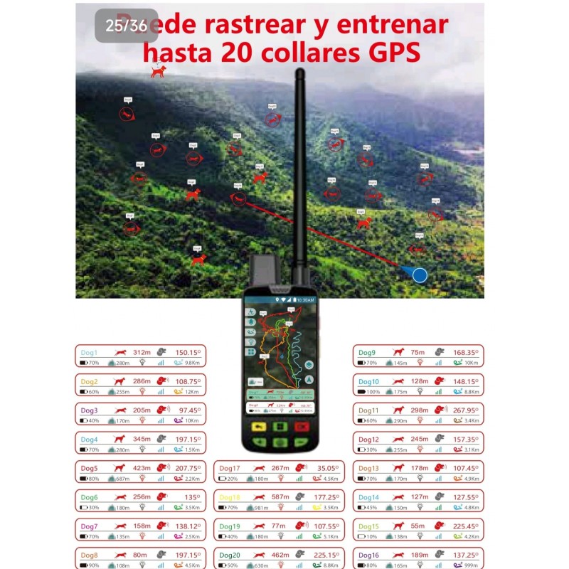 En pantalla vemos a la vez todos lo perros o solo el seleccionado,quien esta en muestra y quien esta corriendo,distancia a los perros,batería de cada collar,distancia recorrida,velocidad del perro,botones de adiestramiento,indicador de luz collar,si están ladrando y escucharlos en tiempo real todos los sonidos alrededor del perro.