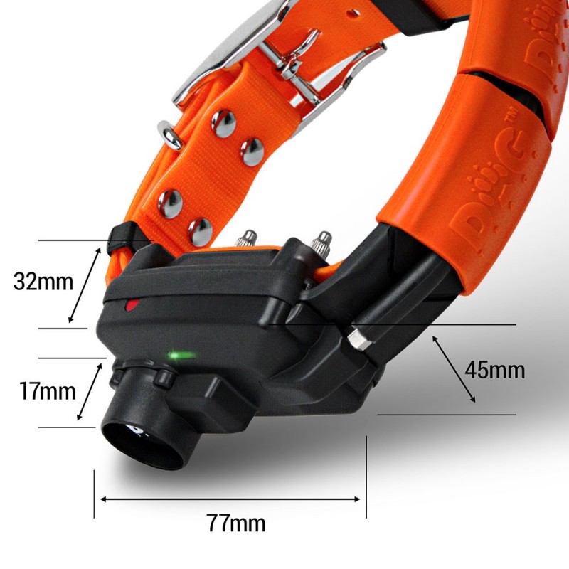 Collar transmisor. Medidas caja electrónica: 77 x 45 x 49 mm. Peso: 172 g (sin correa) Antena flexible de 30 cm.